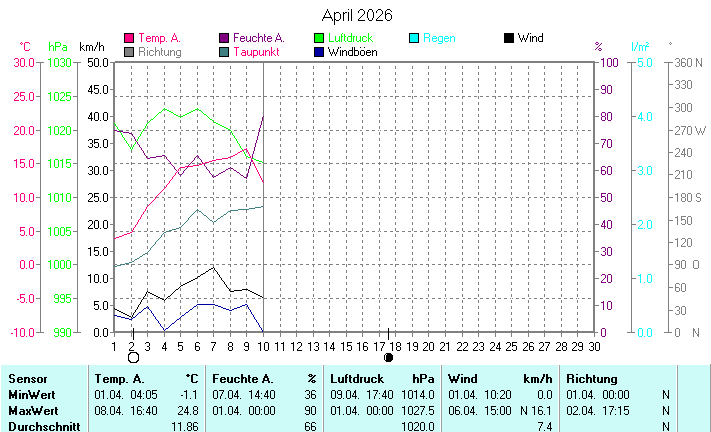 Zum Vergrössern auf das Bild klicken. Temperatur Feuchtigkeit Taupunkt Wind Mittel 10 Minuten Windböen Windrichtung Luftdruck Niederschlag Solarleistung UV Index | ![]() |